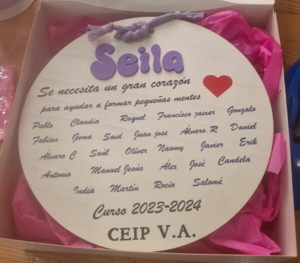 Regala una placa personalizada con el nombre del profe y de todos los niños de la clase incluye el curso y centro , un recuerdo que no dejara indiferente a ningún profe .